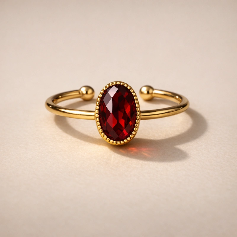 Bague Carmia en plaqué or, ornée d’un grenat facetté rouge profond. Anneau ajustable, élégant et lumineux. Un bijou artisanal raffiné qui apporte force, passion et éclat au quotidien.