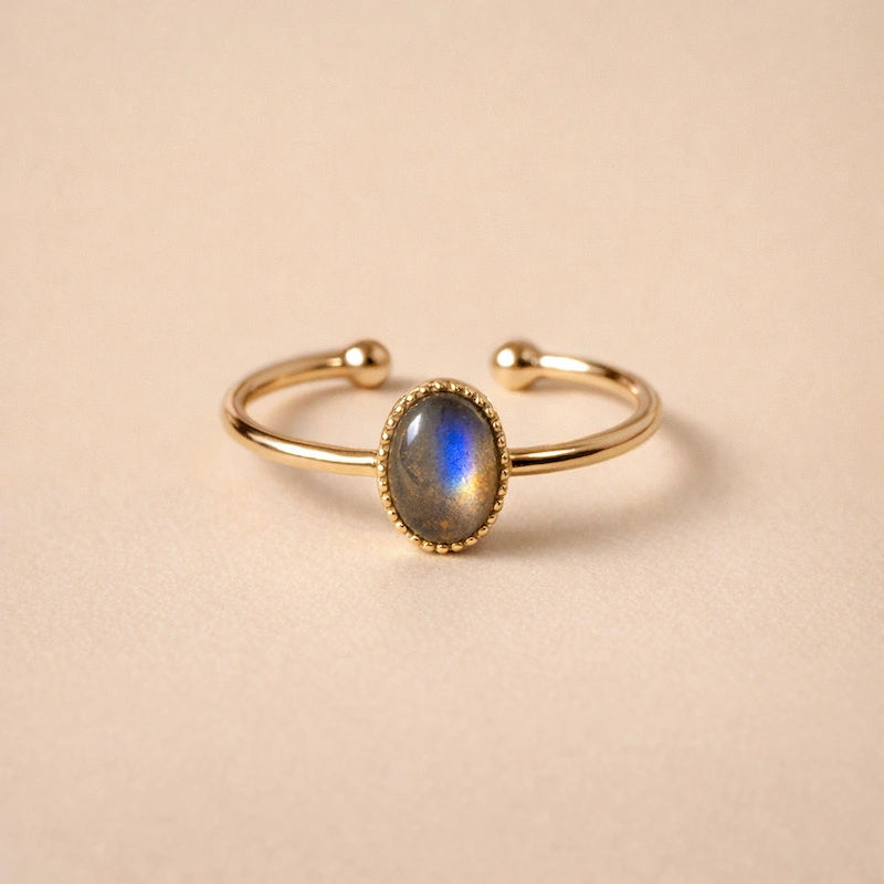 Bague ajustable en plaqué or sertie d’une labradorite naturelle aux reflets irisés. Un bijou lumineux et protecteur, façonné avec soin, où chaque pierre révèle des nuances uniques.