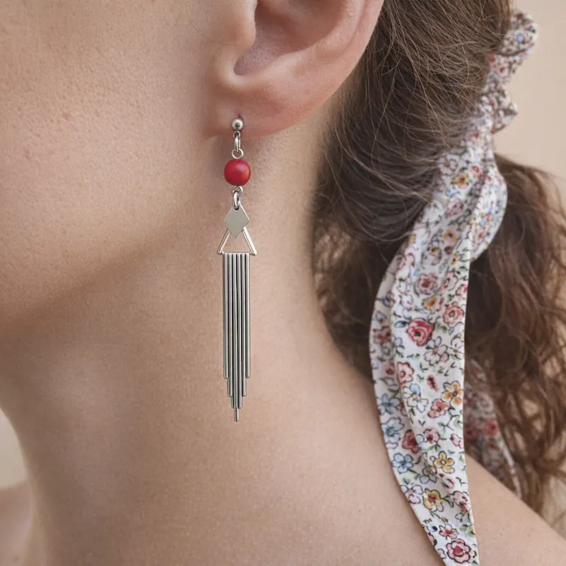 Les Boucles d’oreilles Évasion se distinguent par leur silhouette graphique : une perle colorée éclatante, un triangle argenté minimaliste, et une cascade de tiges fines en argent 925 qui créent un mouvement subtil à chaque geste. Un design pensé pour celles et ceux qui aiment les bijoux contemporains, légers et expressifs.
