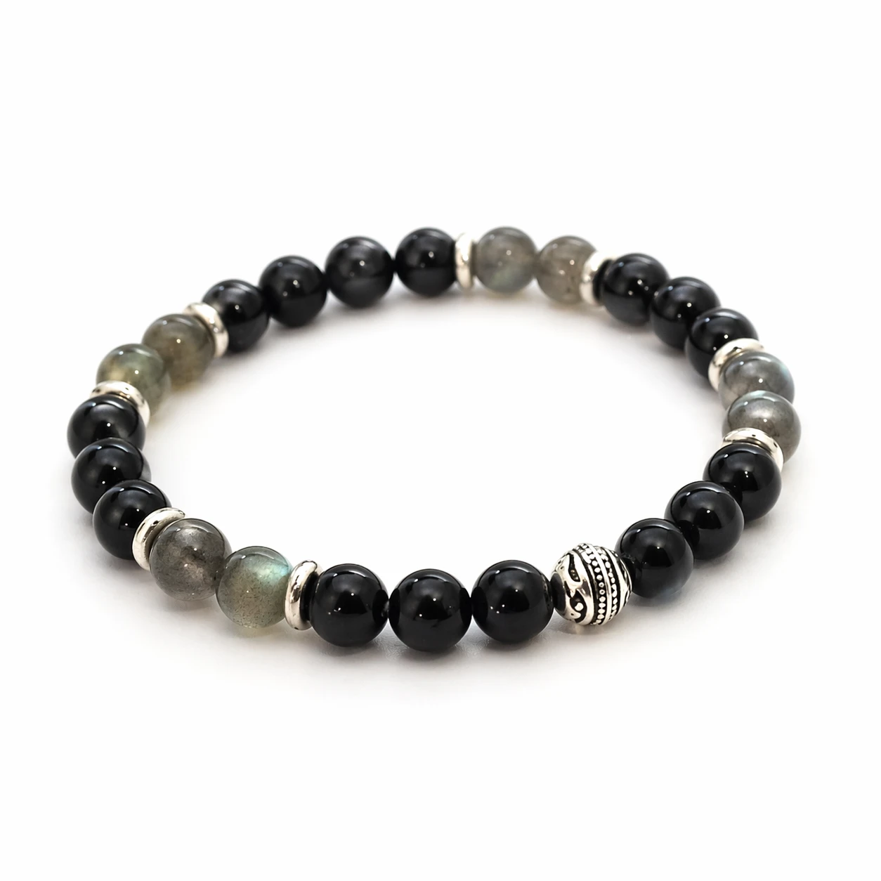 Bracelet en perles naturelles de Labradorite et Onyx noire montée sur fil élastique résistant, bijou élégant et casual pour homme.