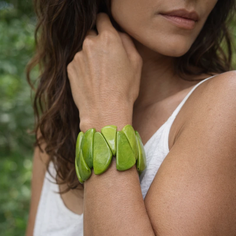 Bracelet élasttique pour manchette composé de fragments d'ivoire végétal couleur vert. Bijou naturel et ethique fait main