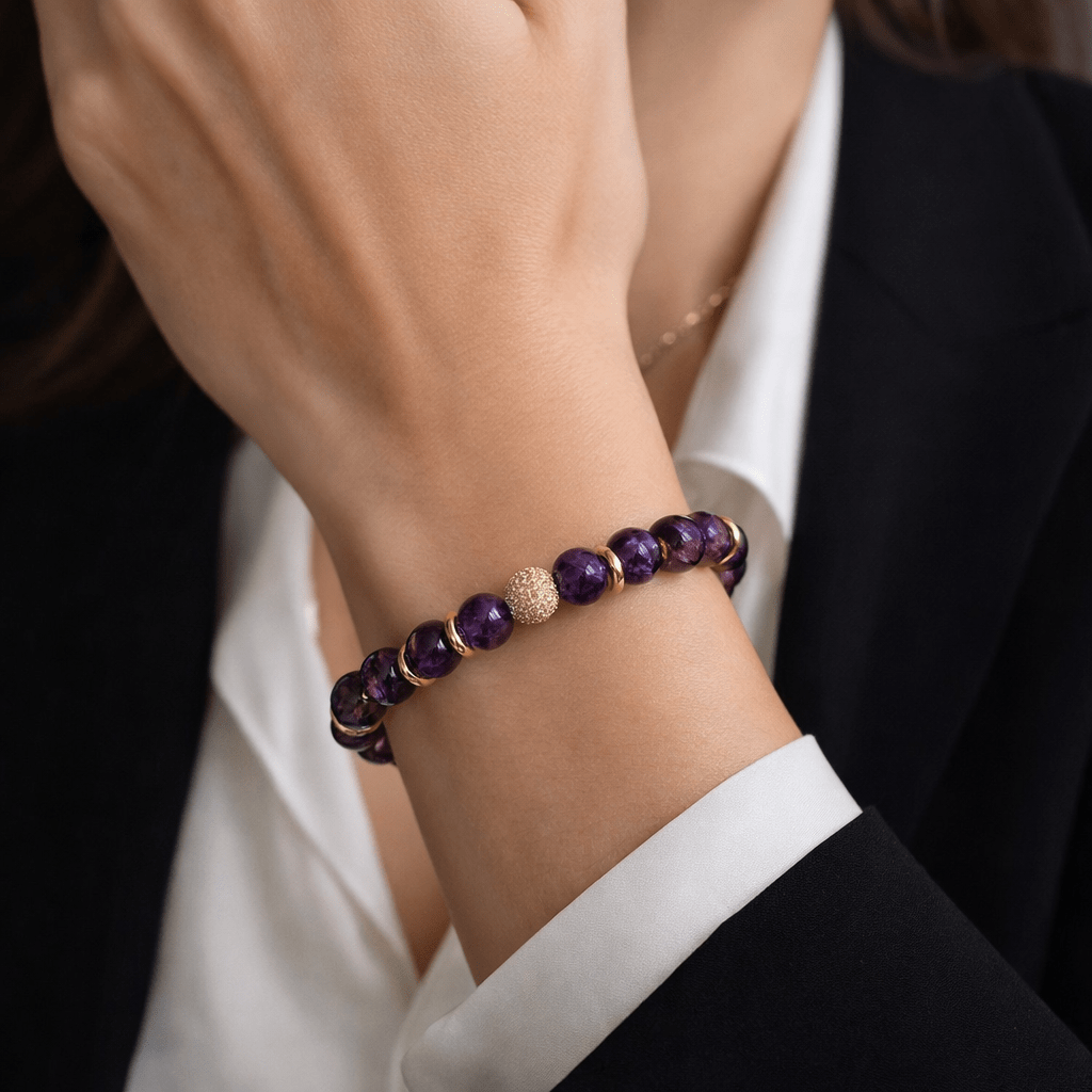 Un bracelet en améthyste naturelle rehaussé de perles dorées, pensé pour apporter une touche élégante et lumineuse à votre poignet. Ses pierres violettes profondes et ses finitions dorées en font un bijou chic, facile à porter au quotidien comme en soirée